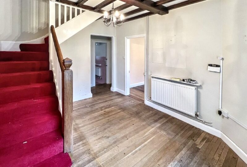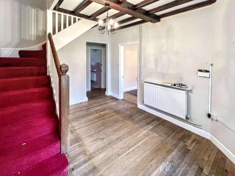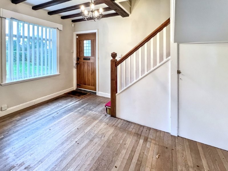 Entrance Hall – 3.15m x 4.14m with oak strip flooring, radiator, double glazed window, under stair store cupboard, stairs to first floor and doors to;